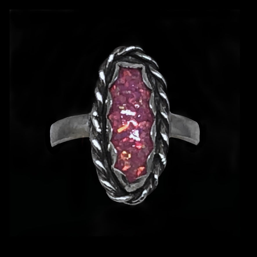 This pink synthetic opal ring is set in Sterling Silver. It is a size 8 but features an open band so it can be adjusted a little bit to fit a slightly different size.