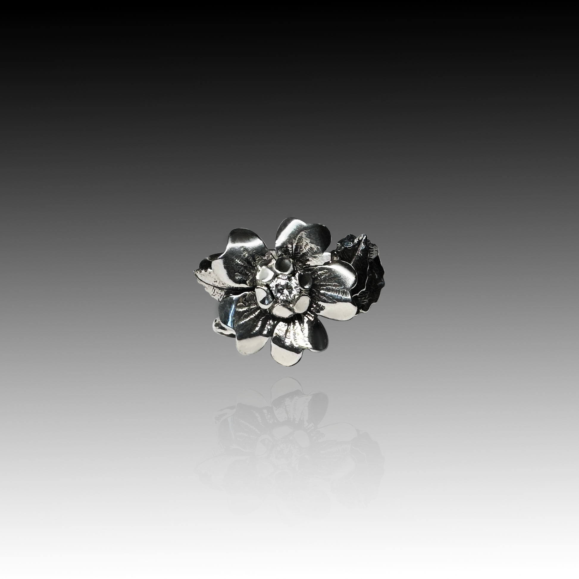 This ring has a unique bead setting at the center. It is entirely handmade, in a size 8.25, with a Cubic Zirconia and Sterling Silver.