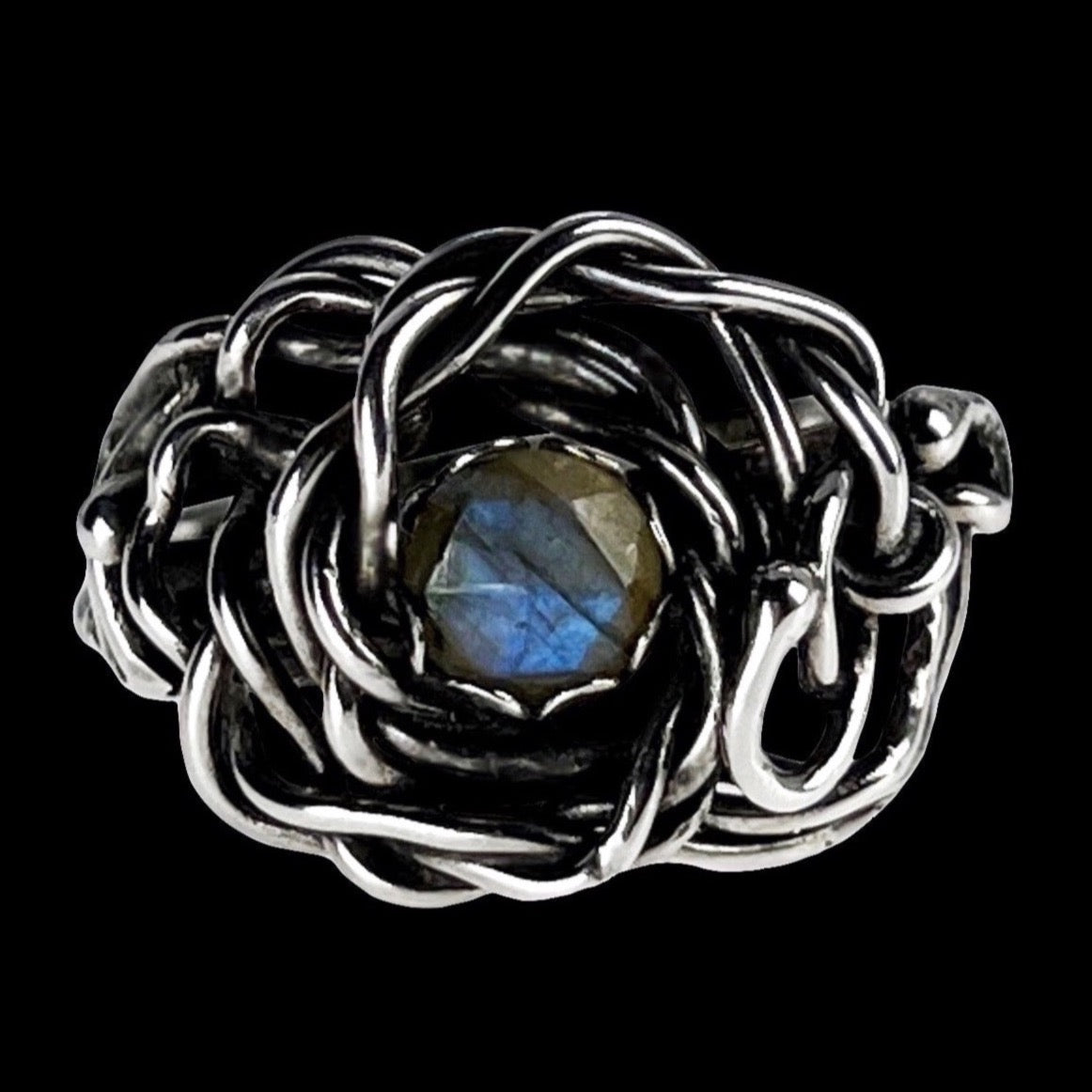 For this ring, I braided strands of silver together to create a mound of texture for the flashy labradorite to settle into. There is so much character in this ring!