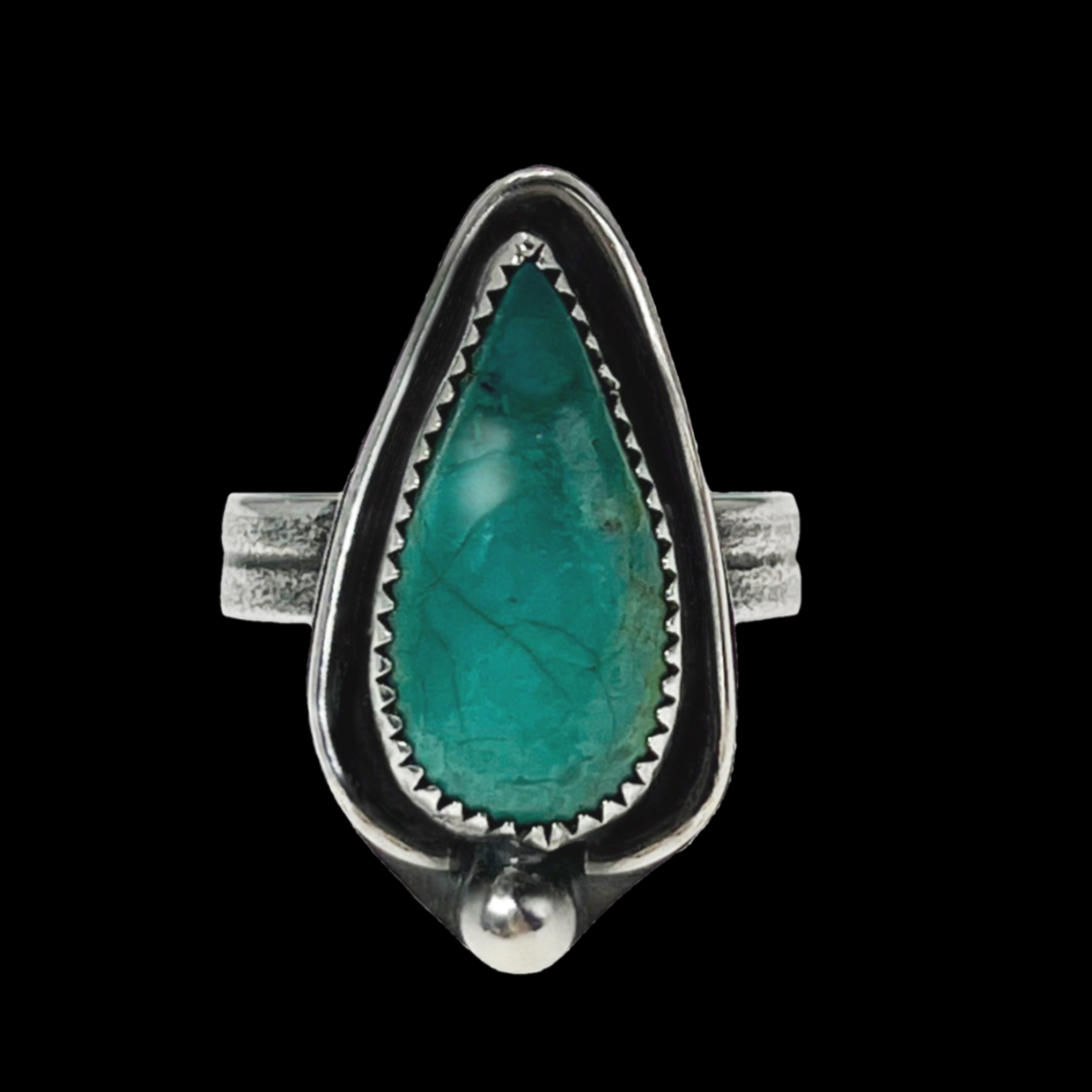 "Doli" is a mesmerizing Teal Blue Turquoise and Sterling Silver Hand-Fabricated Ring, thoughtfully designed in size 8.75. Its unique blend of natural allure and sterling silver craftsmanship creates a truly one-of-a-kind piece.