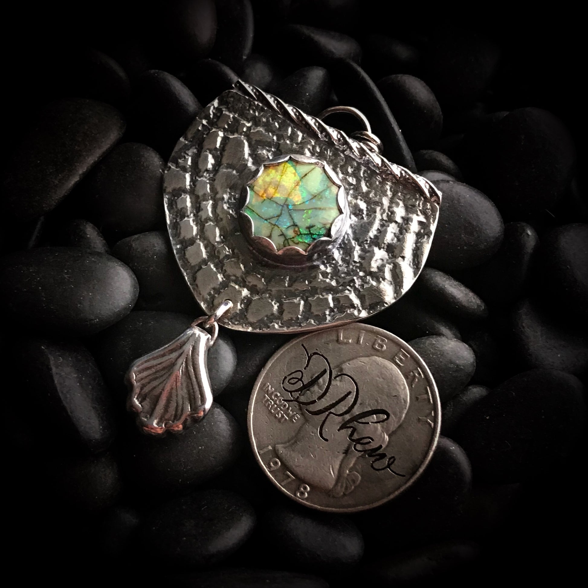 Part of my "Spellbound" Collection, this pendant is made from Sterling Silver. The unique man-made stone in the center is called a "Monet Opal" and it is designed to display a beautiful flash and color.