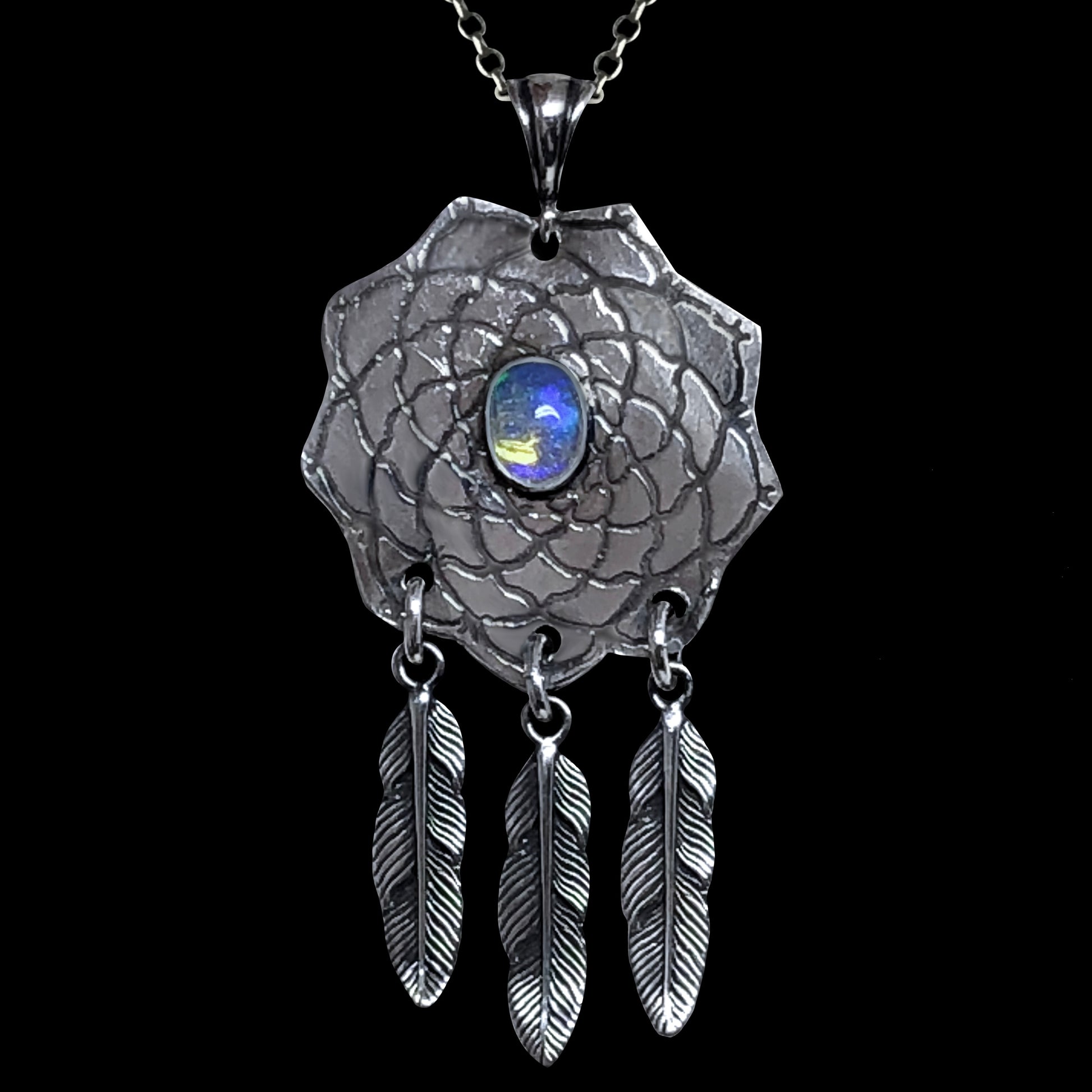 A genuine opal set in an etched sterling silver dreamcatcher with feather charms. It measures approx. 58mm long.