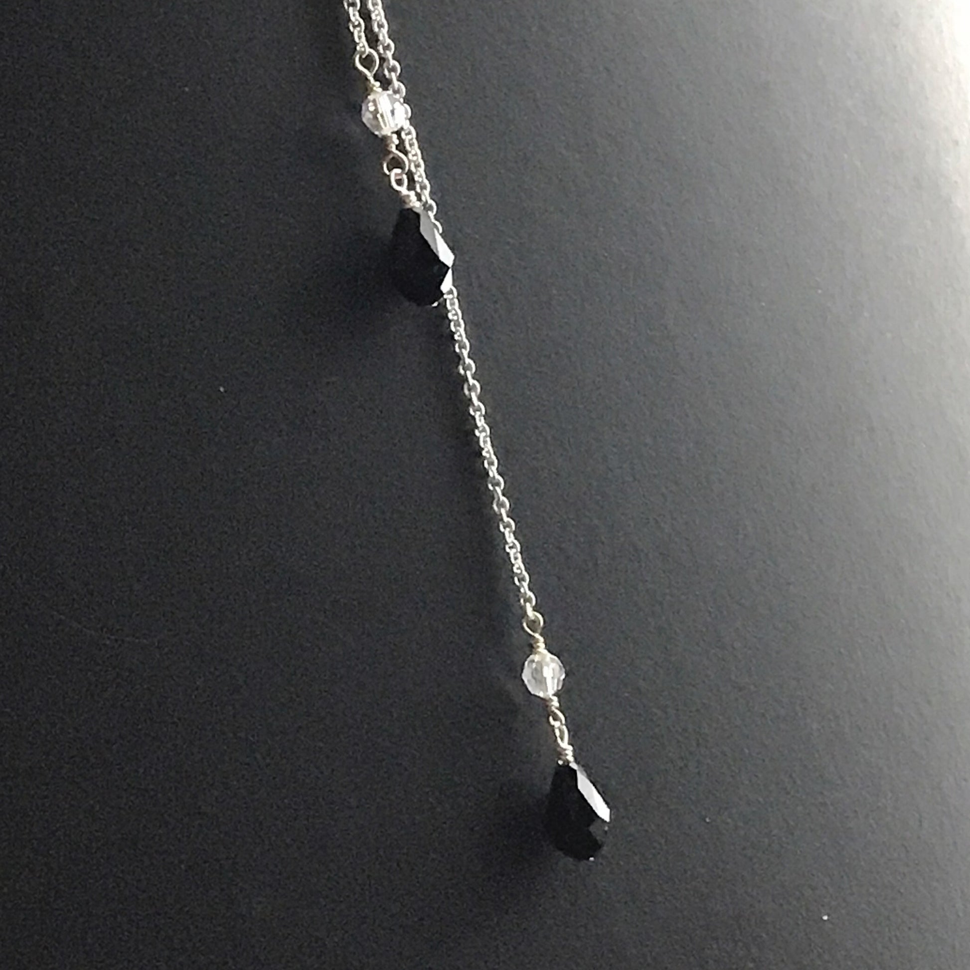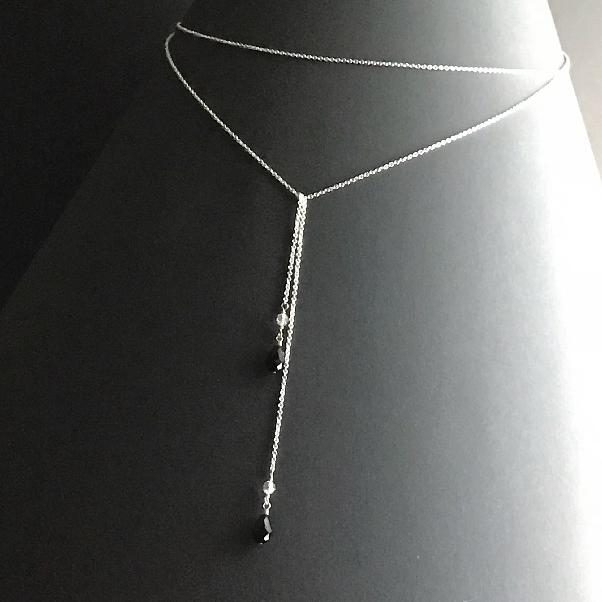 This necklace is approx. 44" and may be worn in many different ways (much like a scarf). It is made of Sterling Silver and Swarovski Crystals.