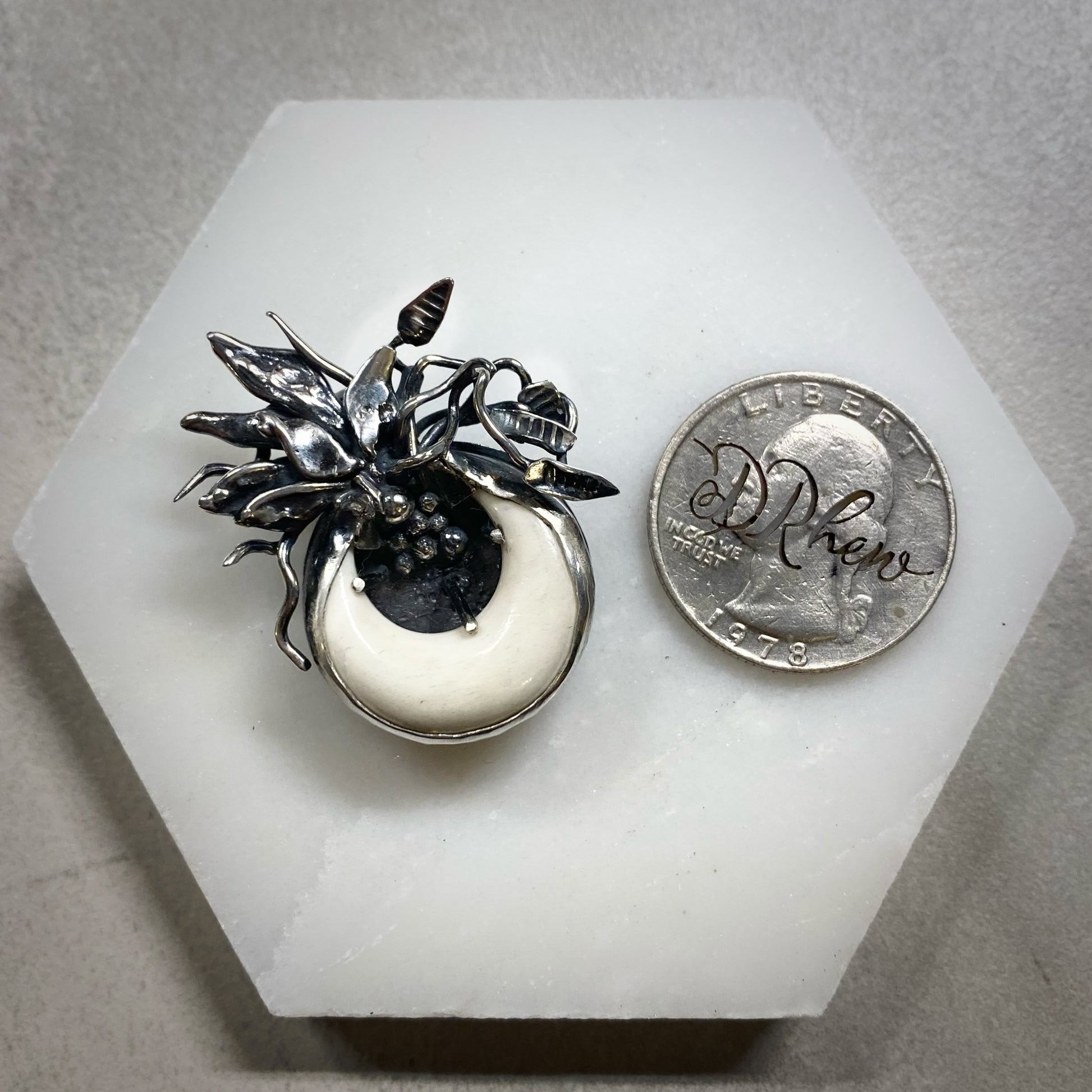 A smooth white buffalo horn makes the perfect vessel for this miniature plant sculpture.
