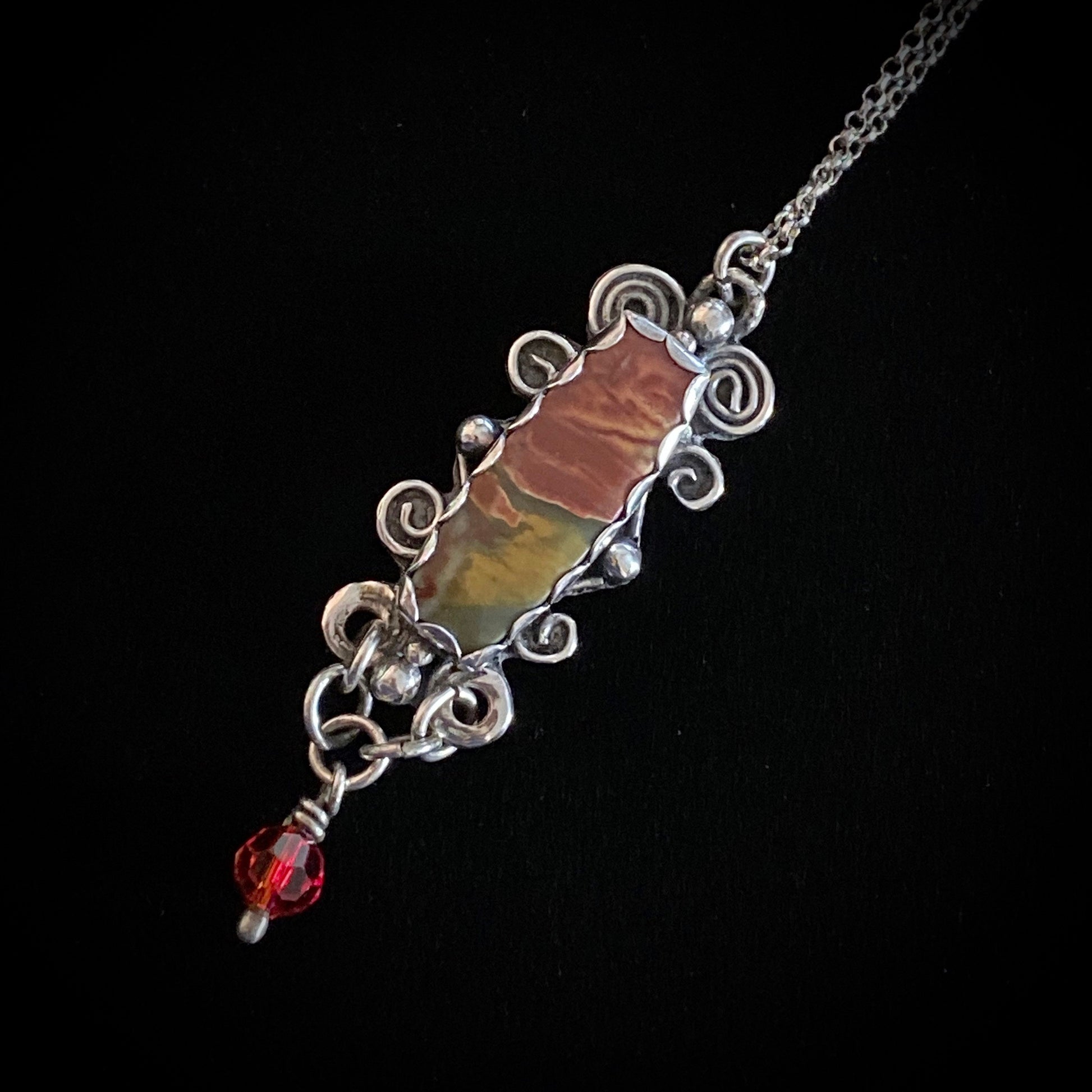 This handmade Picasso Jasper pendant is frame in antique-inspired Sterling Silver. A small Swarovski crystal dangles from the bottom for a little extra drama.