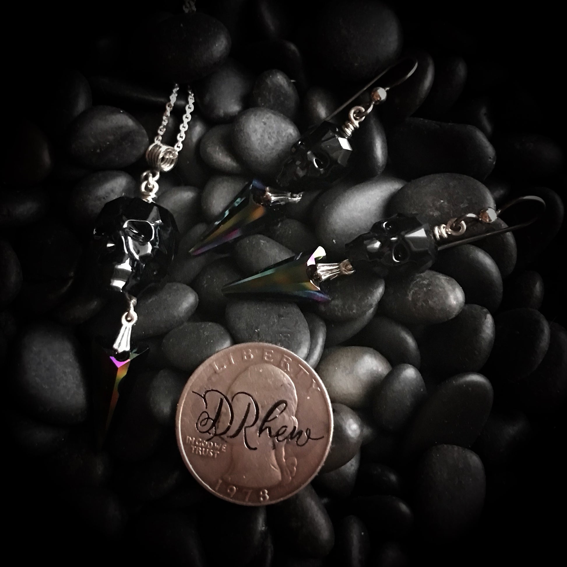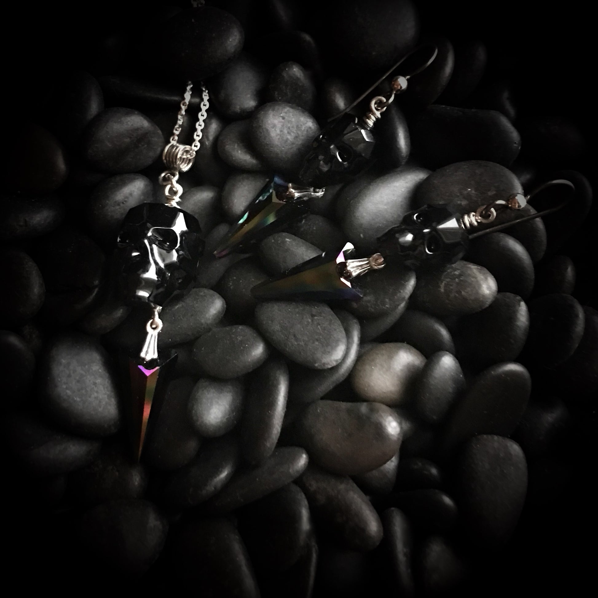 Part of my "Spellbound" Collection, this Swarovski Crystal necklace and earring set is bound in Sterling Silver. The skull is black and the dangle is an oil slick patterned spike. The necklace is adjustable up to 22".