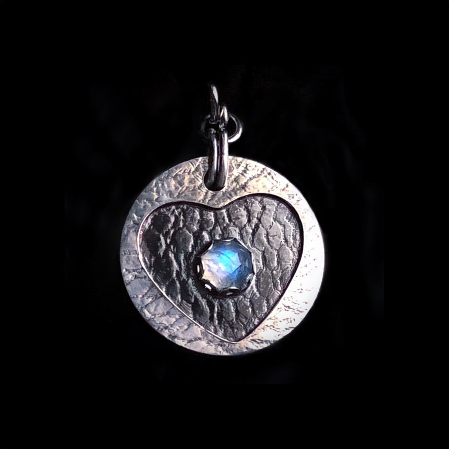It's rich in texture and layered into a medallion with a GORGEOUS flashy moonstone in the center. It is approx 23mm in diameter.